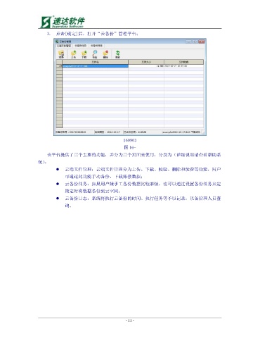 3. 点击[确定]后,打开“云备份”管理平台; 160903 图 16- 该平台提供了三个主要的功能,并分为三个页面来使用,分别为(详细说明请查看帮助系 统): 云端文件管理:云端文件管理分为上传、下载、校验、删除和续费等功能,用户 可通过此功能手动备份、下载账套数据; 云备份任务:如果用户嫌手工备份数据比较麻烦,也可以通过设置备份任务来定 期定时将数据备份到云空间; 云备份日志:系统将执行云备份的时间、执行任务等予以记录,以备管理人员查 询。 - 11 -