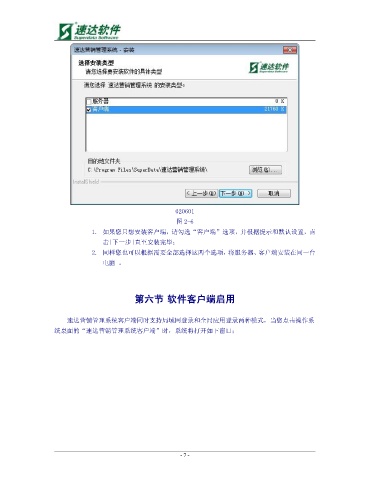 020601 图 2-6 1. 如果您只想安装客户端,请勾选“客户端”选项,并根据提示和默认设置,点 击[下一步]直至安装完毕; 2. 同样您也可以根据需要全部选择这两个选项,将服务器、客户端安装在同一台 电脑 。 第六节 软件客户端启用 速达营销管理系统客户端同时支持局域网登录和全局应用登录两种模式,当您点击操作系 统桌面的“速达营销管理系统客户端”时,系统将打开如下窗口; - 7 -
