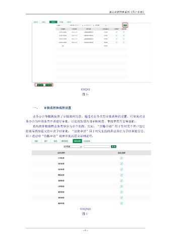 速达营销管理系列《用户手册》 030203 图 3- 一、 审批流程和流程设置 业务办公等模块提供了审批流程功能,通过对业务类型审批流程的设置,可实现对业 务办公当中的各类申请进行审批,以达到加强内部审核制度、掌控费用开支等目的。 系统将审批按照业务类型分为多个流程,比如,“价格申请”用于针对某个客户进行 的商品折扣提交的申请予以审批;“退货申请”用于对发生的商品退货行为予以审批等等。 以下通过对“价格申请”设置审批流程来举例说明: 030204A 图 3- - 4 -