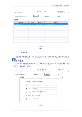 速达营销管理系列《用户手册》 030205 图 3- 三、 发票信息 在销售类单据页面上有一个查询发票信息的功能,点击后可以显示该客户的发票信息。 操作指南 点击单据页面中间的[发票信息],打开“发票信息”查询窗口,其中的内容来源于该客 户资料的“发票信息”页面。 030206 - 6 -