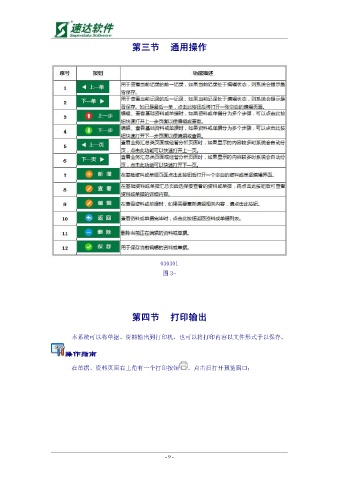 第三节 通用操作 030301 图 3- 第四节 打印输出 本系统可以将单据、资料输出到打印机,也可以将打印内容以文件形式予以保存。 操作指南 在单据、资料页面右上角有一个打印按钮 ,点击后打开预览窗口; - 9 -