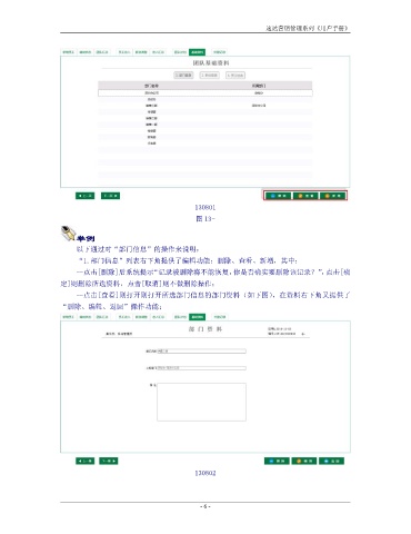 速达营销管理系列《用户手册》 130801 图 13- 举例 以下通过对“部门信息”的操作来说明: “1.部门信息”列表右下角提供了编辑功能:删除、查看、新增,其中: --点击[删除]后系统提示“记录被删除将不能恢复,你是否确实要删除该记录?”,点击[确 定]则删除所选资料,点击[取消]则不做删除操作; --点击[查看]则打开则打开所选部门信息的部门资料(如下图),在资料右下角又提供了 “删除、编辑、返回”操作功能; 130802 - 6 -