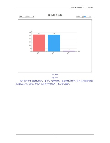 速达营销管理系列《用户手册》 140103 图 14-3 此图表的统计功能更加强大,除了可以按照金额、数量统计排行外,还可以灵活地将更多 的商品进行 TOP 排行,并且可以对多个年份按月、季度进行统计。 - 4 -